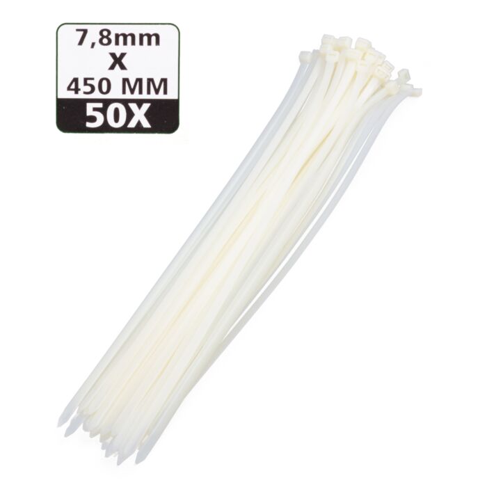 - Set kabelbinders/Tie-Wraps - Inhoud verpakking: 50 stuks- 7,8 x 450 mm- Kleur: wit