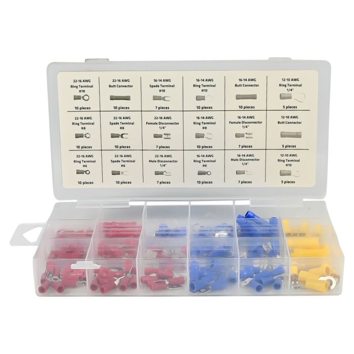 Deze set bestaat uit:- 70 x ringkabelschoen- 25 x kabelschoen- 27 x vlakstekkerconnectoren- 14 x platte stekker kabelschoen- 14 x vork kabelschoen