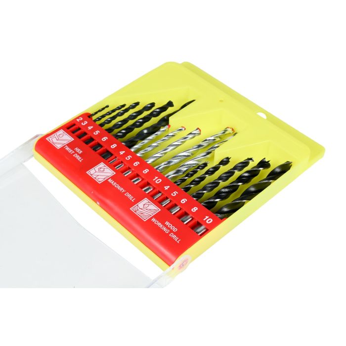 Set van 16 metaal-, steen- en houtborenMetaalboren:2/ 3/ 4/ 5/ 6 en 8 mmSteenboren:4/ 5/ 6/ 8 en 10 mmHoutboren:4/ 5/ 6/ 8 en 10 mm