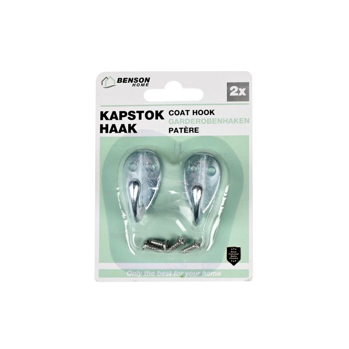 Kapstok hakenIncl. Bevestigingsmateriaal schroeven Afmeting: 4 x 2,5 x 3,5 cm ( hxbxd)Materiaal: zinklegering