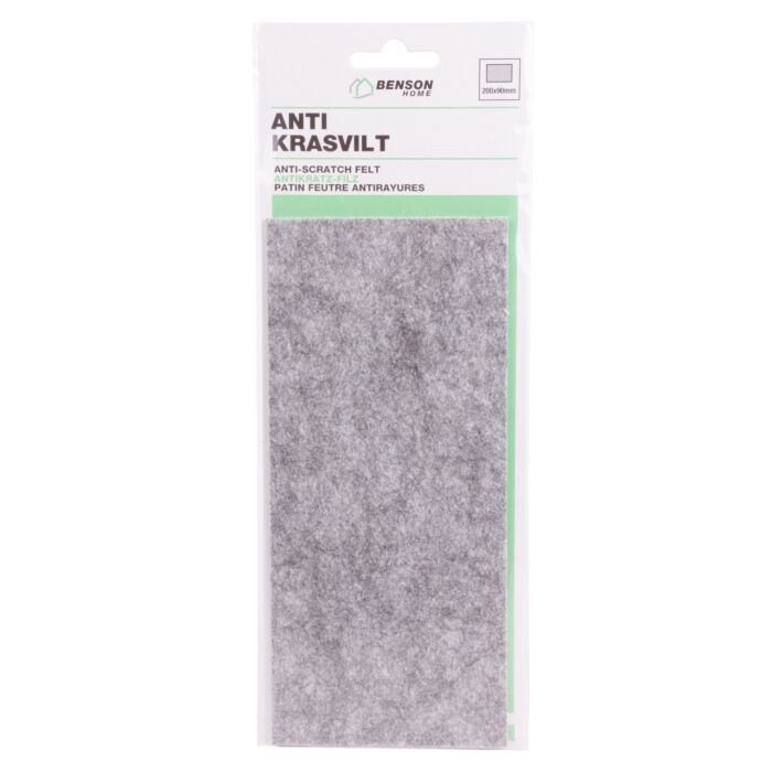 Krasvilt ter bevestiging aan uw meubels om uw vloer te beschermen tegen krassen. Knip deze eenvoudig zelf op maat en het is geschikt voor al uw meubels. Zelfklevend, zodat deze gemakkelijk te bevestigen zijn aan bijvoorbeeld stoel en tafelpoten en poten van een bank of kast.Afmeting: 90x200 mm.Kleur: Grijs.