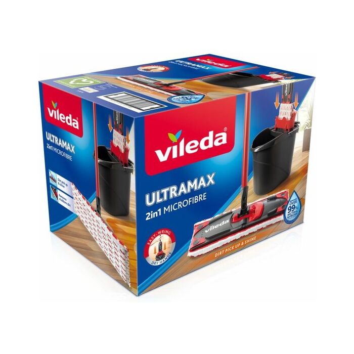 - Complete Ultramax-set bestaande uit een vlakke kop met microvezelhoes, een steel, een emmer en een pers.- Microvezelhoes 2 in 1 om hardnekkig vuil te verwijderen en uitstekende schoonmaakprestaties te verkrijgen- De speciaal ontworpen emmer en asymmetrische pers verzekeren een optimale bevochtiging van de hoes voor gebruik op verschillende soorten vloeren: tegels, vinyl, natuursteen, parket of laminaat.- Schenktuit om het vuile water uit te gieten zonder te morsen- De vervangingen van de hoes zijn apart verkrijgbaar – ze kunnen in de wasmachine gewassen worden aan maximaal 60 °C.