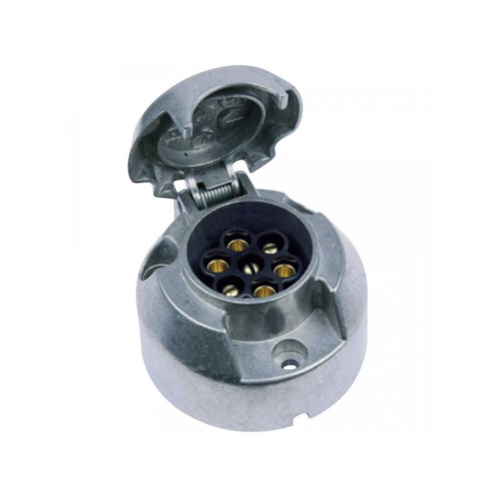 Aanhanger stekkerplug, stekkerdoos 7-polig, metalen behuizing. Voorzien van verende klep voor het afsluiten van de doos