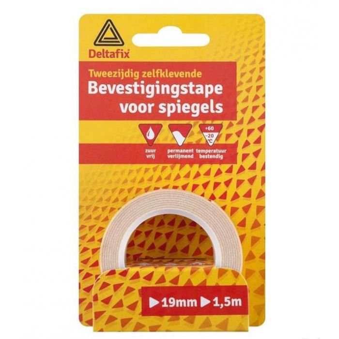 Deltafix tweezijdig zelfklevende bevestigingstape voor spiegels bevat een zuurvrije lijmlaag. Daarom is deze bevestigingstape zeer geschikt om onder andere spiegels op te plakken. Een gladde, niet poreuze ondergrond geeft het beste resultaat.