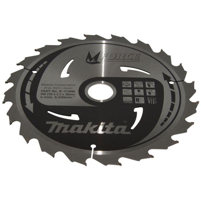 Nieuwe generatie Mforce cirkelzaagblad met vernieuwd tanddesign. Uitermate geschikt voor: zachthout/overlangs en afkorten, geplastificeerd en gefineerd hout, meubelplaat, hardhout/overlangs en afkorten.Geschikt voor: zachthout/fijn afkorten, OSB, duplex-, triplex- en multiplexhout. De tanden zijn voorzien van een dubbele snijhoek van 15 graden wat een agressieve en snelle zaagsnede garandeert. De M-vormige, dubbelsnijdende tand zorgt ervoor dat een afwerking van een 40-tands blad wordt bereikt met een 20-tands blad.
