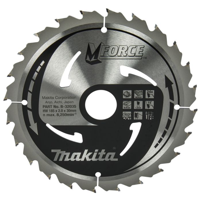 Nieuwe generatie Mforce cirkelzaagblad met vernieuwd tanddesign. Uitermate geschikt voor: zachthout/overlangs en afkorten, geplastificeerd en gefineerd hout, meubelplaat, hardhout/overlangs en afkorten.Geschikt voor: zachthout/fijn afkorten, OSB, duplex-, triplex- en multiplexhout. De tanden zijn voorzien van een dubbele snijhoek van 15 graden wat een agressieve en snelle zaagsnede garandeert. De M-vormige, dubbelsnijdende tand zorgt ervoor dat een afwerking van een 48-tands blad wordt bereikt met een 24-tands blad.