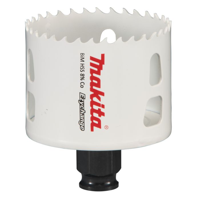 Makita snelwissel gatzaag bi-metaal in diameter 64mm. Door de toevoeging van een 4mm HSS-Co vertanding op de HCS gatzaag is het mogelijk met de gatzaag gaten tot 44mm diepte te realiseren. Het Ezychange snelwisselsysteem maakt het mogelijk snel en eenvoudig naar gatzagen met een andere diameter te wisselen. De grote gaten aan de zijkant zorgen daarnaast voor een efficiënte afvoer van afvalmaterialen.