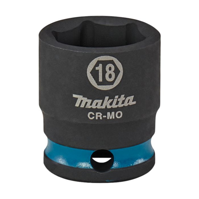 Makita 18mm krachtdop uit de Impact Black serie, met 3/8" VK aansluiting in lengte 30mm. Deze dop is vervaardigd uit Chroom-Molybdeen, heeft een nauwkeurige passing en een lange levensduur. Voorzien van een Makita-teal gekleurde band en maataanduiding.
