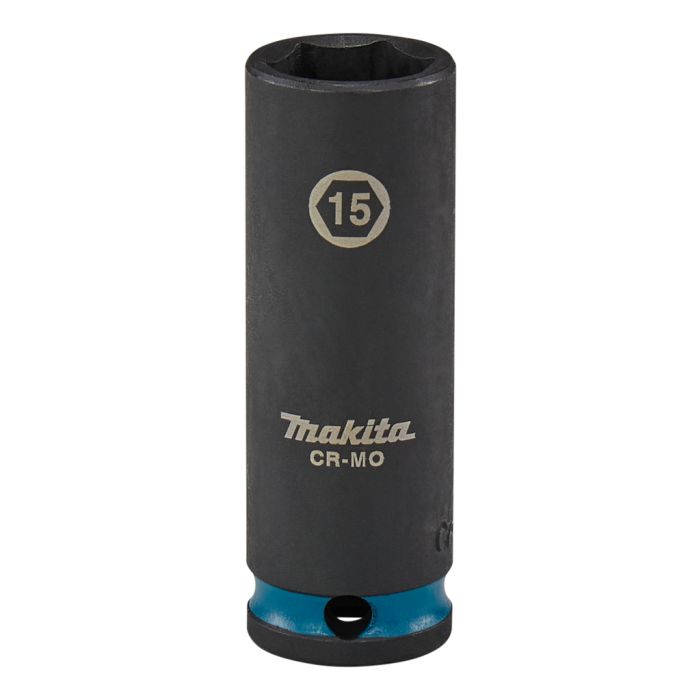 Extra lange Makita 15mm krachtdop uit de Impact Black serie, met 3/8" VK aansluiting met een werklengte van 63mm; perfect voor lastig bereikbare plaatsen. Deze dop is vervaardigd uit Chroom-Molybdeen, heeft een nauwkeurige passing en een lange levensduur. Voorzien van een Makita-teal gekleurde band en maataanduiding.