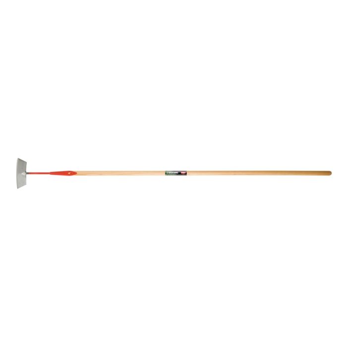 Schoffel met geverniste essen steel, ideaal om al duwend onkruid te verwijderen, te harken en te wieden