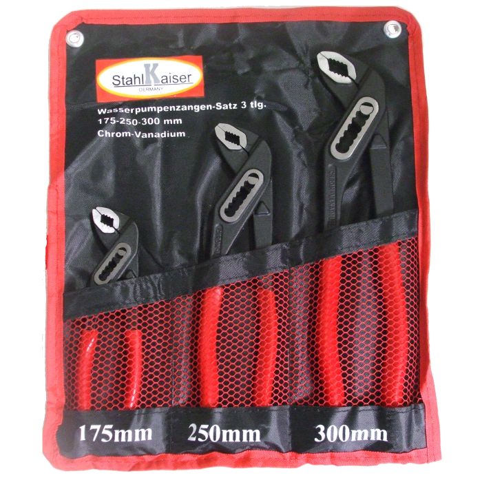 Set van 3 oersterke waterpomptangen (175 mm., 250 mm., 300 mm.) in handige foedraal.